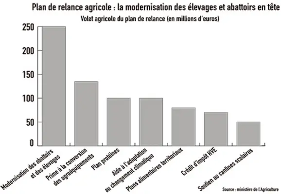 Sur les 100 milliards du plan, les outre-mer représentent 1,5Mrd€, dont 80 M€ destinés à la « transformation de l’agriculture », qui est un des quatre axes dédiés à ces territoires. Dans le détail, les fonds sont alloués à « la diversification des cultures, la modernisation des abattoirs, le renouvellement des équipements », avec pour objectif « d’atteindre d’ici 2030 la souveraineté alimentaire des Outre-mer », comme annoncé par Emmanuel Macron en octobre 2019.